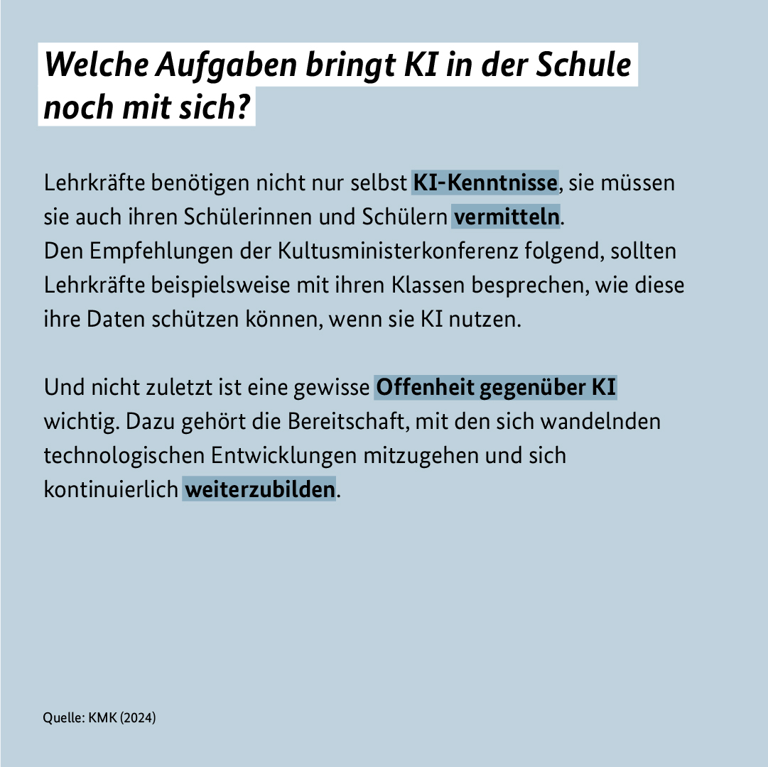 KMK, Kultusministerkonferenz (2024, 10. Oktober). Handlungsempfehlung für die Bildungsverwaltung zum Umgang mit Künstlicher Intelligenz in schulischen Bildungsprozessen. https://www.kmk.org/fileadmin/veroeffentlichungen_beschluesse/2024/2024_10_10-Handlungsempfehlung-KI.pdf